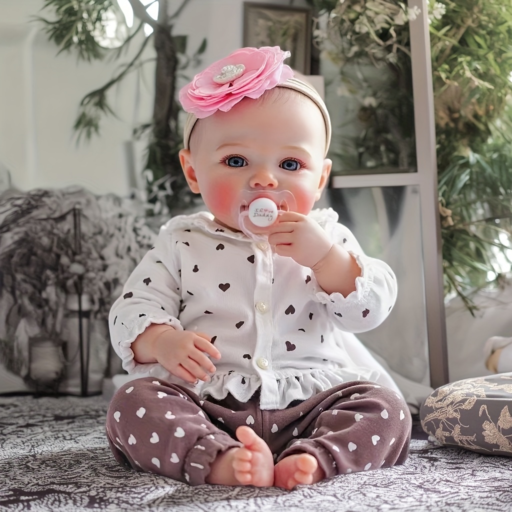 - 18-inch Realistic Vinyl Little Heart Print Top Meadow Handmade Open-Eyed Reborn Doll, Cloth Body Simulation Doll, Hand-Painted Hair, Companion Collectible Toy, Ideal Easter//Birthday Gift Collection (Includes Random Pacifier, Bottle, and Diaper)
